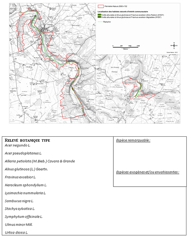 La forêt alluviale se rencontre essentiellement au niveau des îles de l’Anglin qui n’ont pas été encore trop modifiées par les activités humaines. Sur les berges, cet habitat est souvent réduit au simple cordon arboré de la ripisylve et formé essentiellement de l’Aulne glutineux Alnus glutinosa. On rencontre ce type de forêt en quelques endroits relictuels de petites surfaces souvent dégradés notamment aux Dames de Rives ou encore au niveau des berges situées au niveau de Boisdichon. Sur le site d’étude, le type de forêt alluviale est : - l’Aulnaie-frênaie (44.3) : Il s’agit d’une formation arborescente à Fraxinus excelsior et Alnus glutinosa se développant au niveau des terrasses alluviales des petits cours d’eau dominés par les frênes avec Carex remota, Ribes rubrum, Alliaria petiolata, Poa nemoralis, Glechoma hederecea, Lathraea clandestina pour la strate herbacée.
