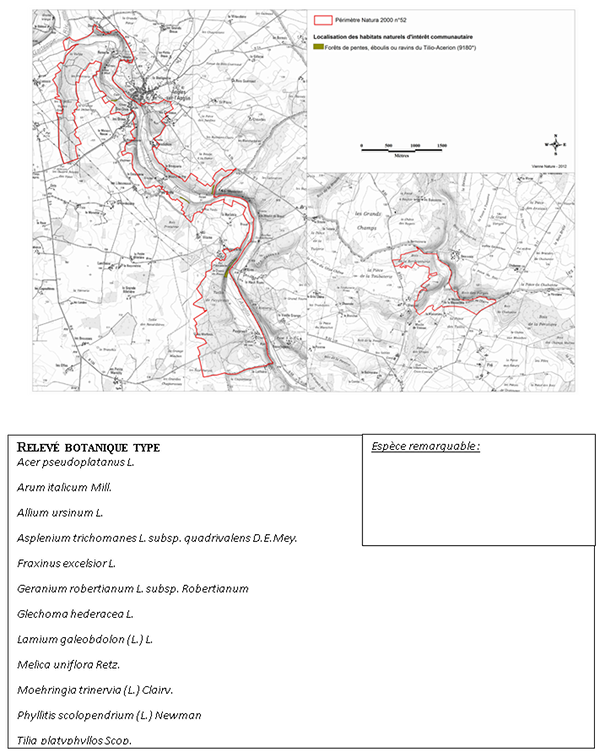 Au niveau de la Vallée de l’Anglin, ce type de forêt s’est développé sur des matériaux calcaires parfois au pied des falaises comme c’est le cas au niveau des falaises de Puygirault. Elles sont généralement composées d’une strate arborée constituée d’Erable sycomore, de Frêne ou de Tilleul et d’une strate herbacée où les fougères comme la Scolopendre sont abondantes. On trouve d’autres très beaux exemples insérés dans des massifs forestiers plus vastes comme au Coteau de Sainte-Croix, Rezan ou Pied Griffé. En revanche, le site localisé sur la commune de Béthines en est dépourvu. Difficile d’accès, ce type de forêt est très peu exploité ce qui lui confère parfois un aspect plutôt chaotique, avec de nombreux chablis et troncs morts au sol en décomposition. Cette physionomie est à privilégier pour ce type de forêt car les nombreux bois morts sont à l’origine d’une très grande diversité entomologique.