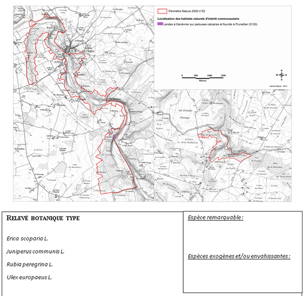 Des formations à Genévriers ont été recensées au niveau des Dames de Rives à Saint-Pierre-de-Maillé au sommet des falaises de Puygirault. Elles constituent un manteau arbustif plus ou moins dense par endroits qui prépare l’installation de la Chênaie pubescente voisine dans laquelle on trouve quelques Genévriers parsemés. Cet habitat relativement pauvre en espèces, parfois mono-spécifique entre en compétition avec un autre habitat d’intérêt communautaire : les pelouses calcicoles sèches.