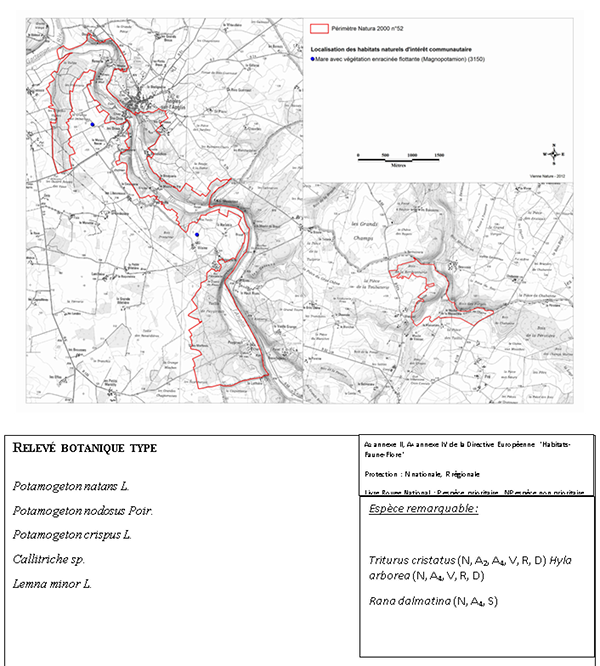 Au sein même du site Natura 2000 seules deux mares sans végétation aquatique ont été recensées. Elles ne sont donc pas considérées comme des habitats naturels d’intérêt communautaire. En revanche à la périphérie proche du site, c'est-à-dire à moins de 1 km, 5 mares supplémentaires ont été recensées. Parmi elles, deux comportent une végétation aquatique caractéristique des mares et constituent donc des habitats d’intérêt communautaire. Il s’agit de la mare de la Grange aux Imbertons localisée au sein d’une pâture à bovins et de la mare de la Vilaine localisée elle aussi dans une pâture. Elles sont situées toutes deux à moins de 250 mètres du périmètre du site Natura 2000.
