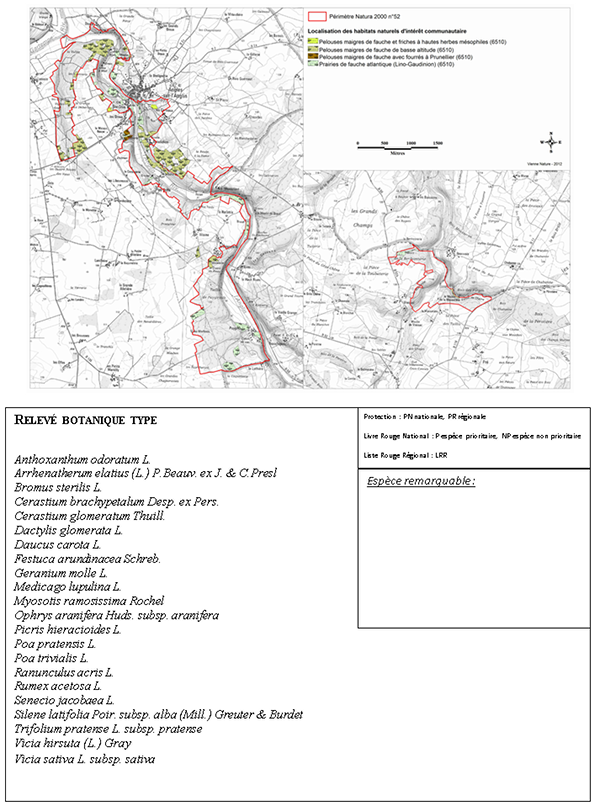 Aujourd’hui, beaucoup des prairies dites « de fauche » ne présentent plus beaucoup d’intérêts biologiques. Cependant le site Natura 2000 « Vallée de l’Anglin » présente la particularité d’avoir conservé un certain nombre de veilles jachères sur des sols moyens à pauvres qui n’ont pas été retournées, ni fertilisées et sont fauchées une fois par an parfois pendant plus de 15 ans. Au fil des années une végétation de pelouse maigre de fauche a donc pu s’exprimer au sein de ces jachères souvent en mélange avec une végétation des friches mésophiles à xérophiles. Certaines de ces pelouses, installées sur des sols localement moins profonds, sont en mélange avec une végétation de pelouses calcicoles sèches (mésobromion et xérobromion). On rencontre cet habitat dans le site sur la commune d’Angles-sur-l’Anglin aux lieux-dits les Certeaux, Boisdichon notamment dans le bocage qui est localisé à la périphérie immédiate du site, mais aussi au niveau de la Grange aux Imbertons.