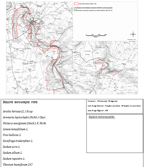 Au niveau des communes d’Angles-sur-l’Anglin et de Saint-Pierre-de-Maillé, la vallée est très encaissée, offrant ainsi de belles parois rocheuses, ce qui n’est pas le cas au niveau de la commune de Béthines. Les falaises calcaires favorables à la présence de cet habitat sont localisées principalement à l’aplomb du château d’Angles-sur-l’Anglin ainsi qu’au niveau du Roc-à-Midi et de Douce. En revanche, les falaises de Puygirault où se pratique l’activité d’escalade semblent dépourvues de ce type de végétation.