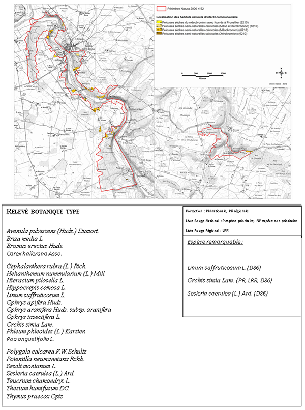 Ces pelouses concernent de faibles surfaces généralement sur le plateau calcaire et/ou en sommet de falaises. Elles sont localisées sur des sols peu profonds parfois en mélange avec une végétation de prés maigres de fauche (6510). Ainsi on les rencontre sur les communes d’Angles-sur-l’Anglin et de Saint-Pierre-de-Maillé aux lieux-dits les Certeaux, Boisdichon, Rezan, le Roc Fondu, la Dames de Rives et sur la commune de Béthines en lisière du Bois des Forges. On trouve au sommet des falaises de Puygirault un faciès particulier de ces pelouses qui est dominé par une graminée relativement rare (3 stations connues pour le département) : la Seslerie bleue. Les pelouses très sèches de type xérobromion sont en bon état de conservation et évoluent très lentement. En revanche certaines pelouses de type Mésobromion ont tendance à s’embroussailler et sont soumises à la colonisation par les ligneux notamment au niveau de la Cocusserie et de Vilaine.