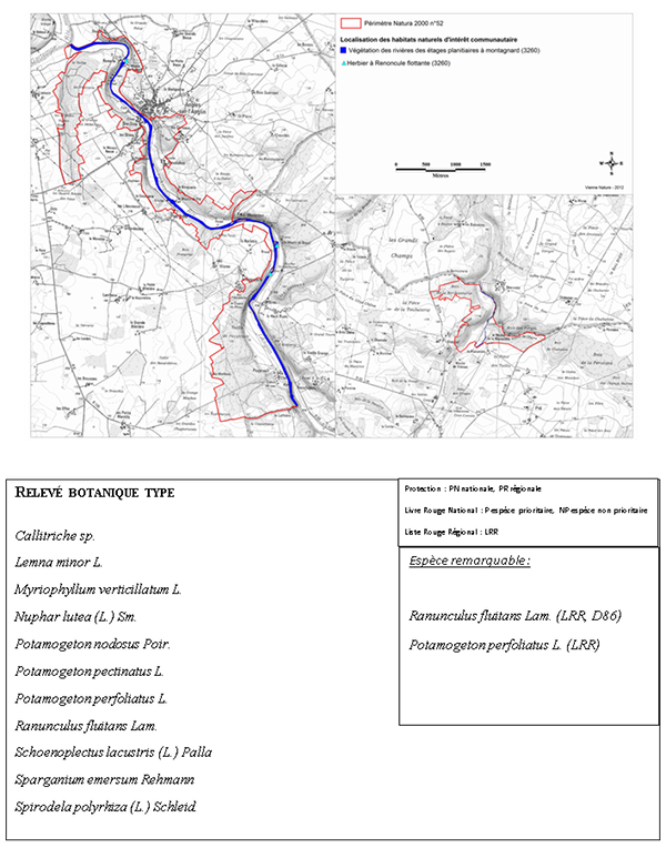 Les herbiers rencontrés sur les linéaires de l’Anglin et du Salleron sont principalement composés de Renoncules flottantes (Rancunculus fluitans) mélangées parfois avec quelques potamots (P. nodosus, P. pectinatus, P. perfoliatus…), le Rubanier immergé (Sparganium emmersum) mais surtout dominés par les Nénuphars (Nuphar lutea). Des petits tapis de Callitriche ont été recensés régulièrement sur tout le linéaire de l’Anglin et du Salleron. En revanche seul l’Anglin semble être favorable au développement d’herbiers à Renoncules au niveau des îles et des seuils. A noter la coexistence du Potamot perfolié indicateur d’une eau plutôt de bonne qualité et du Potamot pectiné qui lui au contraire à une amplitude écologique beaucoup plus large. L’Anglin n’est pas particulièrement une rivière de bonne qualité cependant les sources qui se déversent au niveau de ses berges rendent les eaux localement beaucoup plus minérales ce qui permet certainement à P. perfoliatus de pouvoir se développer.